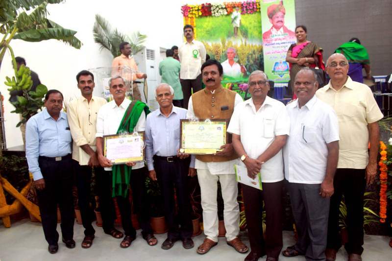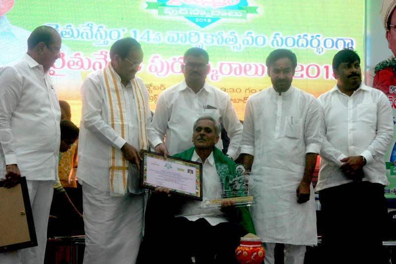 Honourable Vice President of India Shri M Venkaiah Naidu felicitated Innovator Shri Galla Chandrashekahar for his innovative herbal Nematicide and Shri P Veera Raghava Reddy for his contribution to Print Journalism with "RAITHU NESTHAM" Award on 7 October 2018